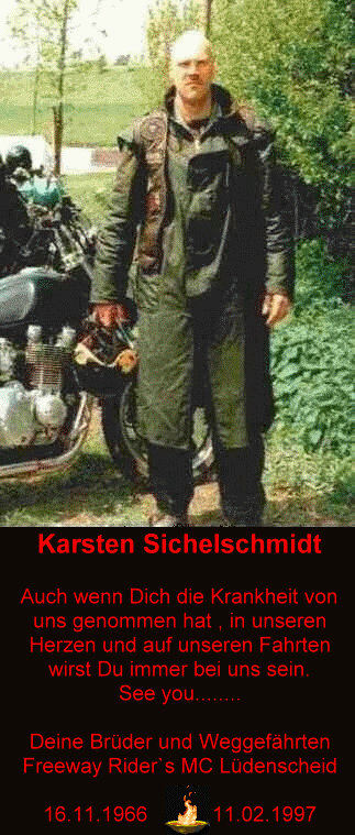 Es ist jedoch der Lauf der Zeit, dass einige diese Gemeinschaft irgendwann verlassen, so auch die viel zu früh verstorbenen Member Karsten und Dietmar des Freeway Riders MC Lüdenscheid. Ihnen zu Ehren erinnert sich das Chapter jedes Jahr im Rahmen einer Memory-Party an ihr Wirken im Club.