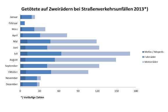 In den letzten zehn Jahren ist die Zahl der in Deutschland tödlich verunglückten Motorradfahrer von 996 im Jahr 2003 bis jetzt um deutlich mehr als ein Drittel gesunken. Im gleichen Zeitraum ist der Bestand an Motorrädern in Deutschland kontinuierlich gestiegen. Ist deshalb die Welt in Ordnung? Keineswegs!