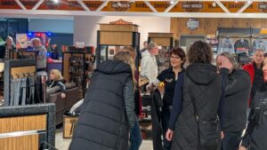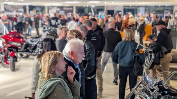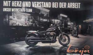 Da ich ohnehin noch Karre fahren wollte, cruiste ich frühzeitig rüber und war positiv überrascht, dass die umfangreichen Parkflächen sowie die große Wiese bereits recht gut gefüllt waren. Allerdings mit Autos, weniger mit Bikes. Nun, die gab es ohne Ende in dem riesigen Showroom von Börjes zu begutachten, und es bildeten sich viele Grüppchen, die sich die Schätze aus Milwaukee genauer anschauten und ausgiebig fachsimpelten. Fakt ist, bereits gegen 19 Uhr war die Hütte ordentlich voll. Die zahlreichen Besucher quatschten in relaxter Atmosphäre, zogen sich ein Bier oder standen an der Imbissbbude Schlange. Somit war klar, dass auch diese Aktion beuchertechnisch alles andere als ein Rohrkrepierer sein würde.