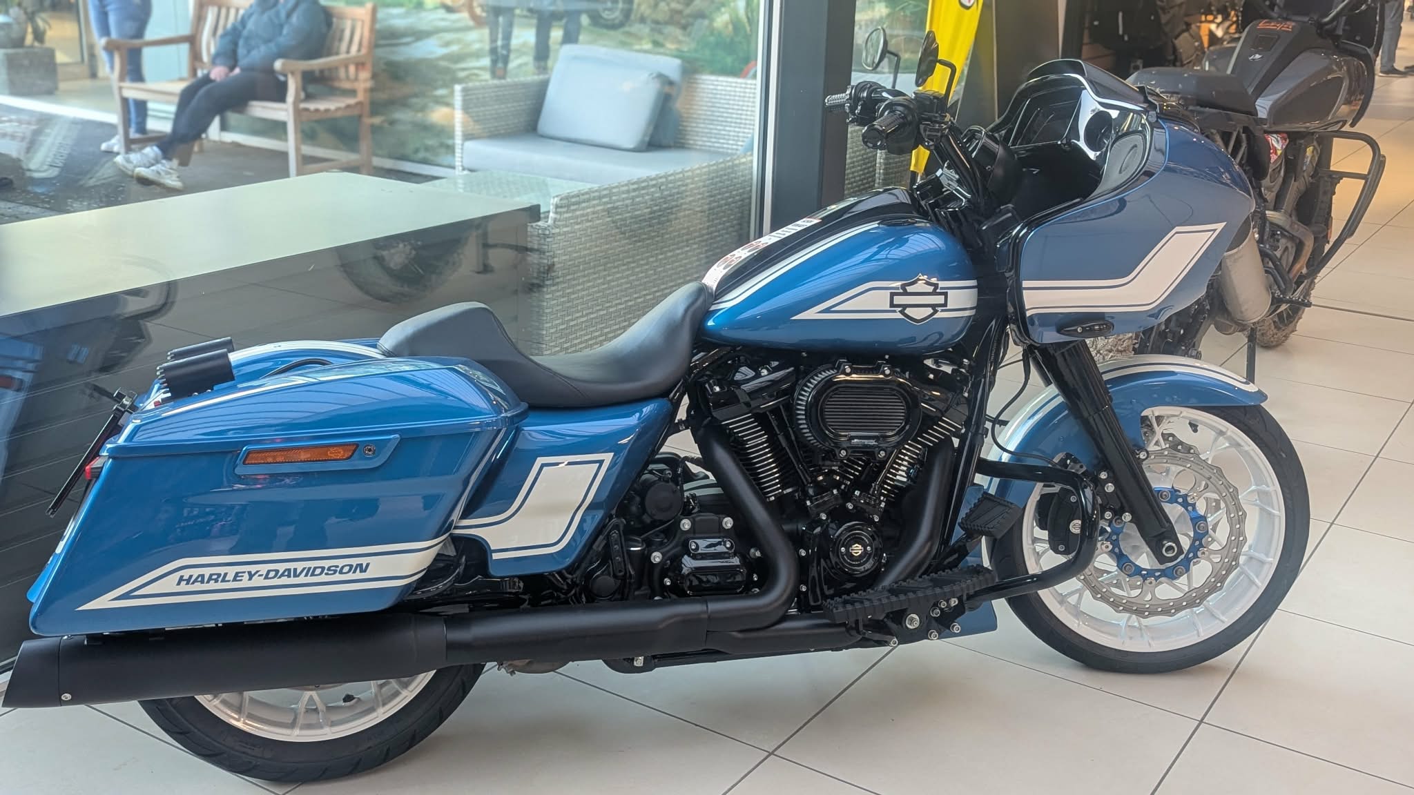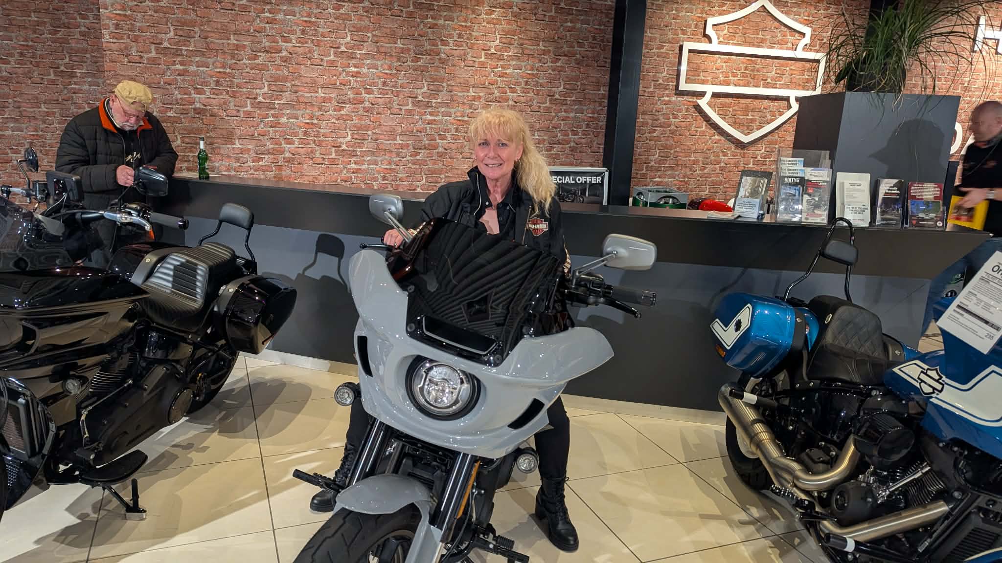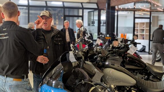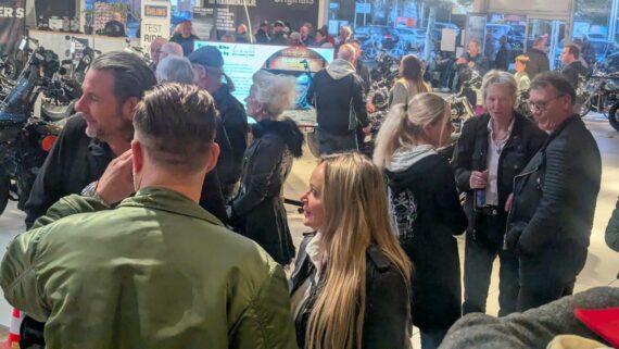 Da ich ohnehin noch Karre fahren wollte, cruiste ich frühzeitig rüber und war positiv überrascht, dass die umfangreichen Parkflächen sowie die große Wiese bereits recht gut gefüllt waren. Allerdings mit Autos, weniger mit Bikes. Nun, die gab es ohne Ende in dem riesigen Showroom von Börjes zu begutachten, und es bildeten sich viele Grüppchen, die sich die Schätze aus Milwaukee genauer anschauten und ausgiebig fachsimpelten. Fakt ist, bereits gegen 19 Uhr war die Hütte ordentlich voll. Die zahlreichen Besucher quatschten in relaxter Atmosphäre, zogen sich ein Bier oder standen an der Imbissbbude Schlange. Somit war klar, dass auch diese Aktion beuchertechnisch alles andere als ein Rohrkrepierer sein würde.