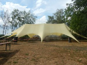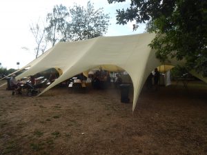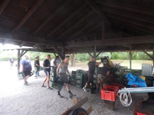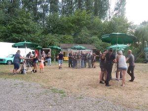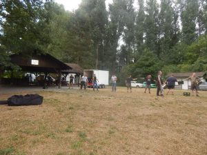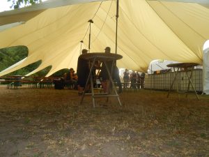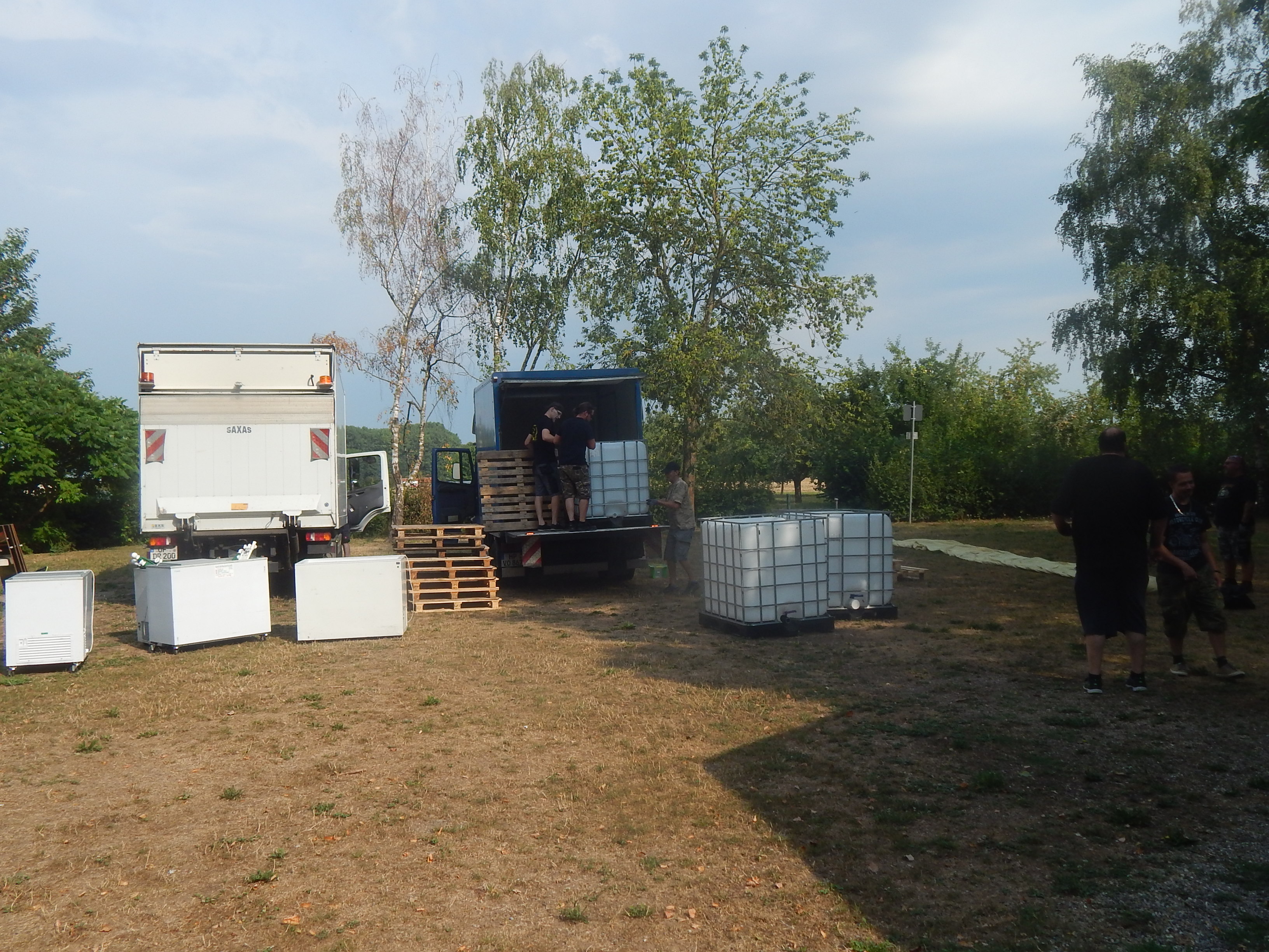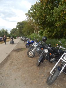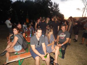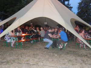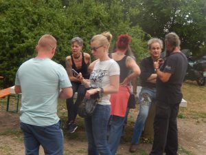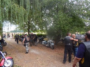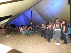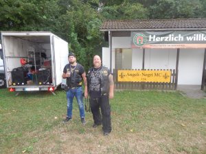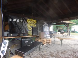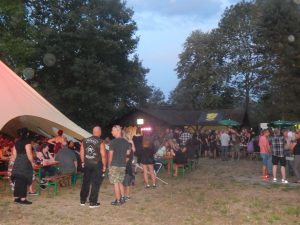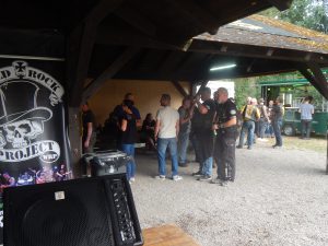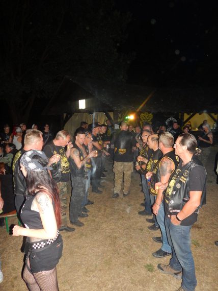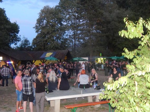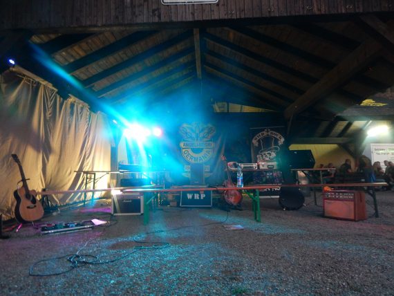 Das Chapter Wunsiedel war bereits eingetroffen, gute Gelegenheit sich vorzustellen. Langsam trudelten die Bandkollegen und die ersten Gäste ein. Der Platz füllte sich zunehmend und ein Ende war nicht in Sicht. Daher verlegten wir unser erstes Set um 45 Minuten nach hinten. Große und kleinere Clubs rollten an und auch der Anteil an zivilen Gästen wuchs beträchtlich. Gegen 20.45 Uhr stiegen wir in das Konzert ein. Die Stimmung auf dem gesamten Platz war sehr locker und nahezu herzlich.