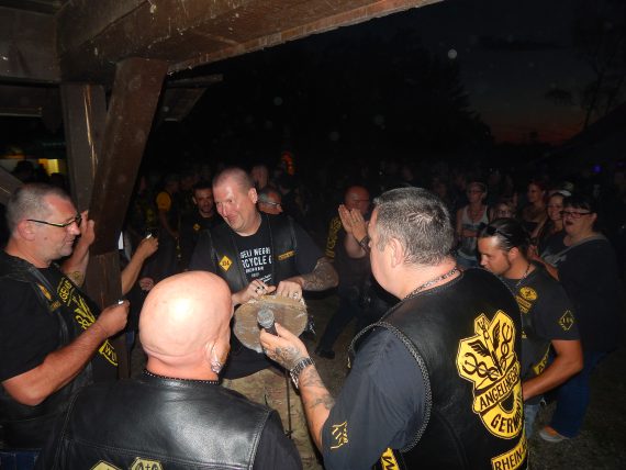 Ich denke, bereits im ersten Set konnten wir einen Achtungserfolg verbuchen, denn auch wenn Rocker nicht dafür bekannt sind, dass sie frenetisch Applaus spenden, so waren viele Augen auf uns gerichtet. Die Negris waren jedenfalls absolut zufrieden und für unser zweites Set hatten wir ja noch eine Überraschung parat. Denn einer der Prospects wurde an diesem Abend in die Bruderschaft aufgenommen. Spontan hatte ich die Idee, dass wir die Setfolge ändern und den Song „Brothers“ unmittelbar vor der Taufe spielen, um die Prozedur einzuleiten.