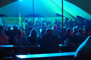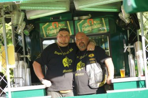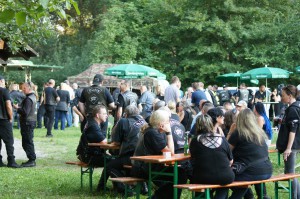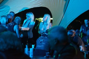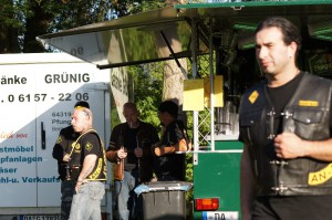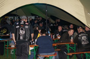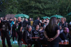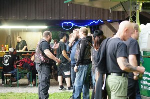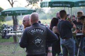 Als wir gegen 19 Uhr bei bestem Sommerwetter beim Partygelände ankamen, war der Platz schon sehr gut gefüllt. Auch zu späterer Stunde kamen immer noch Mopedfahrer vorbei und reihten sich ins Getümmel ein. Die Jungs waren, wie immer, sehr gut organisiert, die Mädels am selbstgebauten Tresen aus alten beleuchteten 1000l Tanks waren sehr flink, der Jacky floß in Strömen, der Äppelwoi wurde von den Nordlichtern aber mit Vorsicht konsumiert, der norddeutsche Magen verträgt das nicht unbedingt!