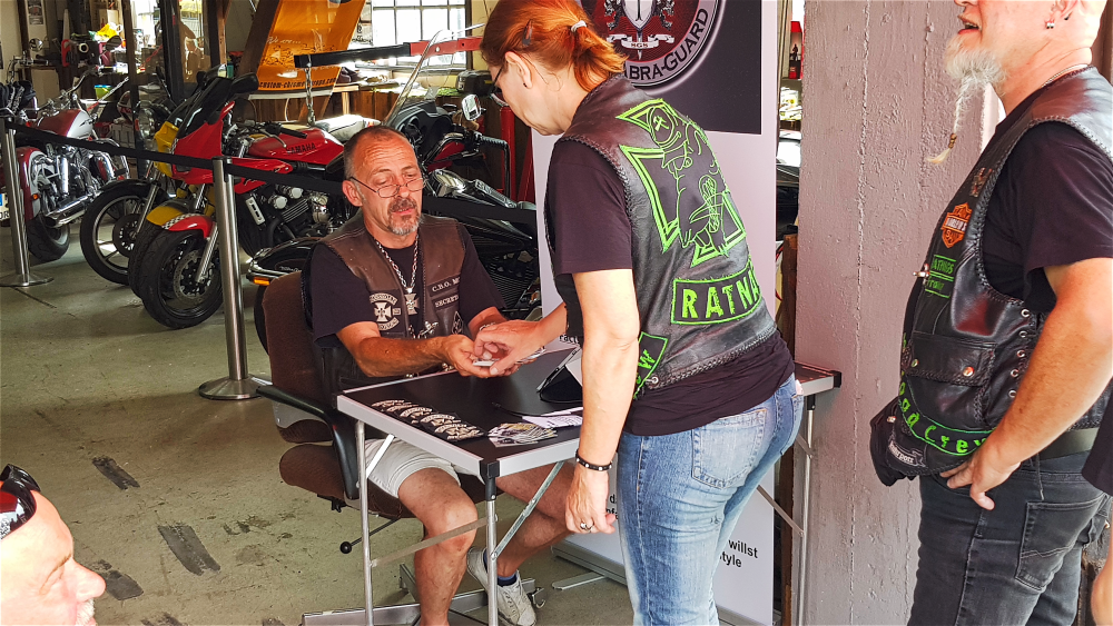 Pünktlich um 19:00 kamen wir in Wulfen zur Abschlussparty wieder an. „Hobel abstellen, Beine ausschütteln und erstmal stärken.“, dachte ich mir. Nach der Nahrungsaufnahme wurde die Verkaufsmeile begutachtet. T-Shirts inkl. Individueller Veredlung direkt vor Ort, eine Lederschneiderei und ein Stand mit Schmuck waren auf dem Bike Parkplatz des Clubgeländes angesiedelt. Eine Stimme aus dem Innern des Clubhauses ertönte und bat alle Anwesenden darum, sich zur Siegerehrung einzufinden. Nach der Housekeeping-Ansprache folgte die Nennung der Kennzeichen mit den 10 besten Pokerblättern an – die gezogenen Karten wurden zum Kennzeichen des Teilnehmers erfasst – von denen mir aber niemand persönlich bekannt war.