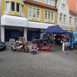 Grundsätzlich war es richtig, die Livemusik von Claus und Daniel von der Band „Daalschlag“ bereits um 11 Uhr beginnen zu lassen. Brillen Weigmann, Schumann Design, das Roadhouse Route 6 sowie www.bikesmusicandmore.com übernahmen diesen Part. Denn als auf dem zentralen Punkt Marktplatz noch große Leere herrschte, konnten wir bereits einen guten Besuch in der Biker-Meile verzeichnen. Schade nur, dass mit Ausnahme von Schumann Design und dem City Café, alle anderen Geschäfte noch geschlossen waren. Leute, ihr wolltet Traffic, er war da!