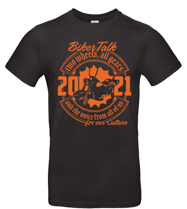 Veröffentlicht am 22. November 2020 auf 600 × 669 in Biker Talk 2021: Das Merchandise-Angebot! Shirt Black Orange Man Mann Schwarz