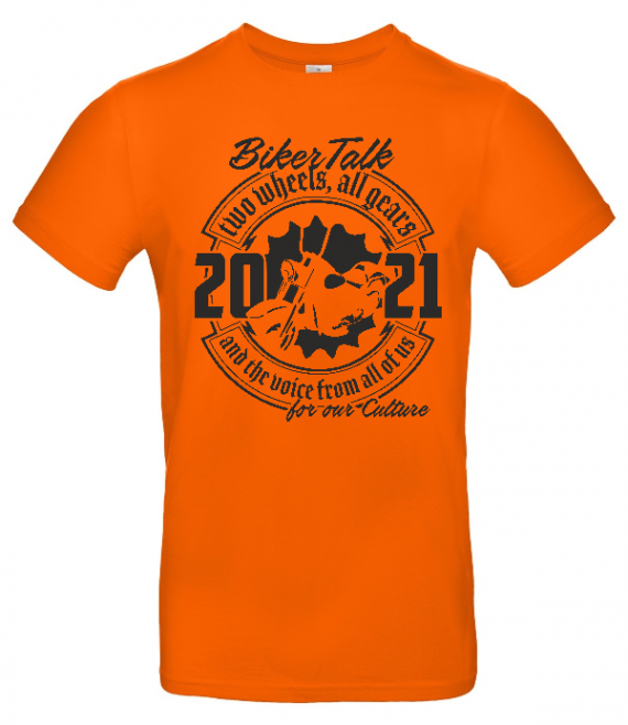 Veröffentlicht am 22. November 2020 auf 600 × 693 in Biker Talk 2021: Das Merchandise-Angebot! Shirt Orange Black Man Mann Orange