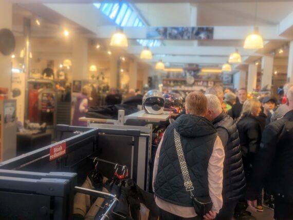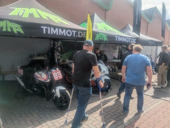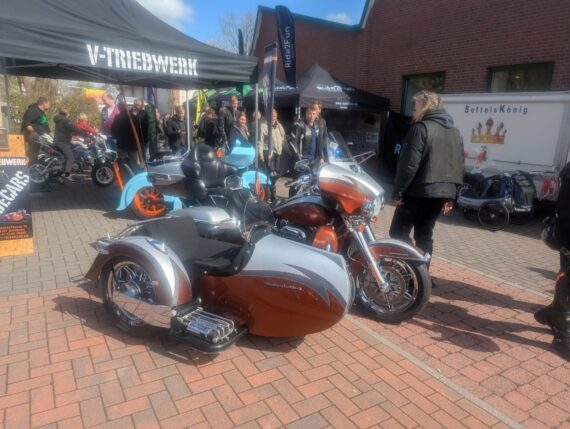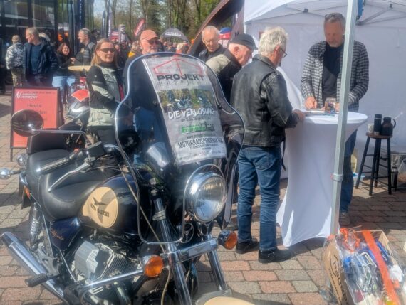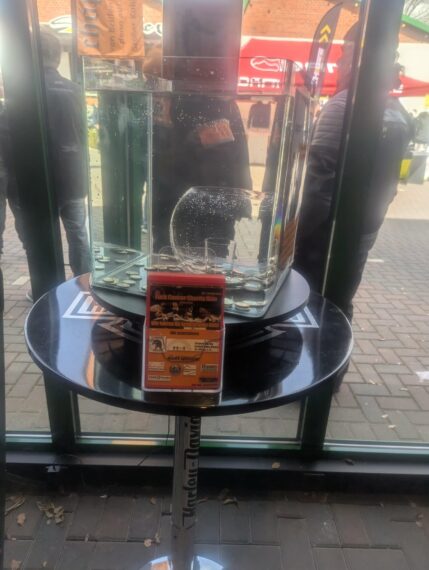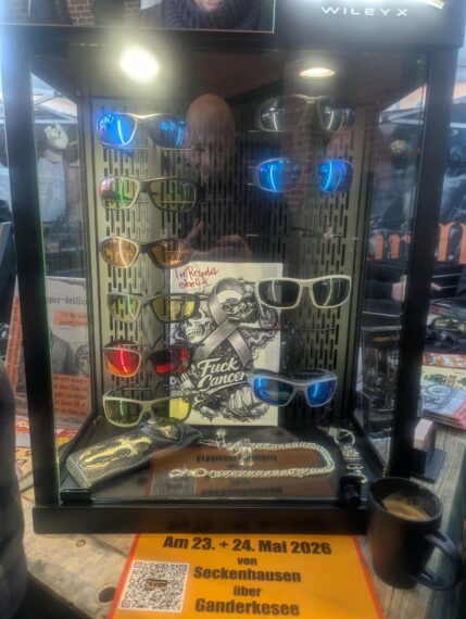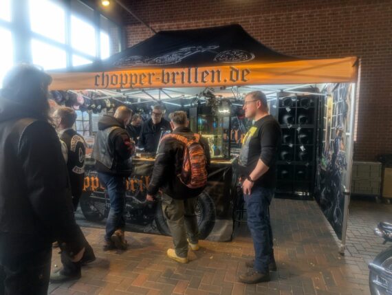 Chopper-brillen.de stand da, wo man ihn erwarten konnte. Sein Stand wurde stetig gut besucht. Cool fand ich die Charity-Aktion für den FCCR 2026. Die Besucher konnten versuchen, in einem mit Wasser gefüllten Gefäß, ihre Geldstücke in das auf dem Boden platzierte Schnapsglas zu befördern. Bei einem Treffer gab es einen Gutschein. Alles andere geht als Spende an den oder die Profiteure des FCCR