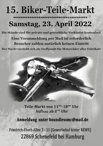 ich prognostiziere, dass dieser 15. Biker-Teile-Markt des Boundless MC einen enorm hohen Zulauf erhalten wird. So war es immer und so wird es ganz sicher auch 2022 sein. Save the Date!