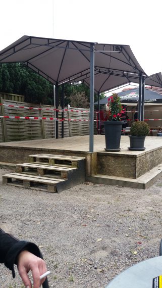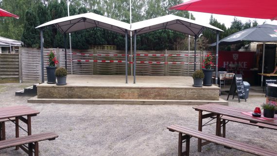 Das Highlight ist sicherlich das neue Bühnenoutfit. Mit einfachen, aber optisch wirkungswollen Mitteln, hat man dem stabilen Bühnepodest mit zwei Pavillions ein festes Dach verpasst. Auch im Innenbereich wirkt das Roadhouse Route 6 sauber und stylisch. Die Tische im Restaurantbereich waren einladend dekoriert, der kleine Saal hat eine schöne Atmosphäre. Hier kann man in gemütlicher Runde Steaks und Burger, die Spezialitäten des Hauses, genießen.