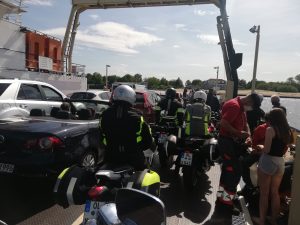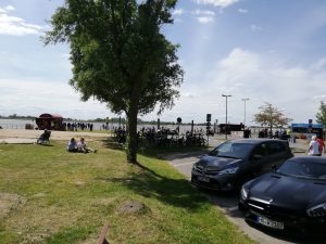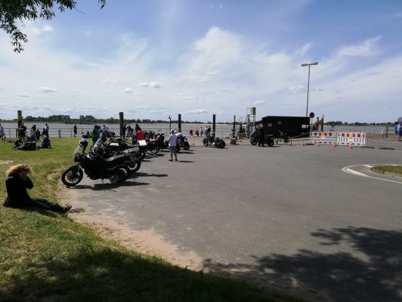 Am Ziel war es keinesfalls so voll, wie ich es erwartet hatte. Zirka einige Dutzend Bikes waren am ehemaligen Fähranleger abgeparkt, rechts stand ein Fischimbiss, links ein Getränkewagen. Nun, mein Backfisch mit selbst gemachten Kartoffelsalat war schmackhaft, vielleicht mit 7,50 Euro preislich etwas überzogen. Egal, wenn es schmeckt passt das für mich. Sitzgelegenheiten gibt es aktuell nicht, vermutlich wegen der Abstansregeln. Nun, dann pflanzt man sich halt auf den Rasen.
