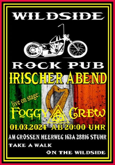 Ein Mottoabend, der bisher an sich immer funktionierte und viele Besucher anlockte, war in der Vergangenheit im Rock Pub Wildside die Irish Night und in besonders guter Erinnerung blieb die von vor zwei Jahren, bei der die Band Foggy Crew mit seinem traditionellen irischen Folkrock eine mega-gute Stimmung erzeugte.
