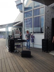 Im Inneren bereitete sich die Band Nightliner auf ihren Auftritt vor. Deren Soundcheck ließ die Qualität der Band bereits erahnen. Pünktlich stiegen die Männer in den Gig ein. Obwohl die loungige Atmosphäre auf der Dachterrasse eine derbe Konkurrenz darstellte, konnte die Kombo durchaus einige Partygäste ins Innere locken und zum Tanzen animieren. Das hatte sie auch verdient, denn ihre Coversongs kamen dynamisch und kraftvoll rüber.