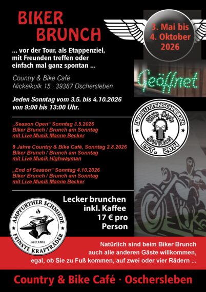 Um es gleich mal festzuhalten, dass Country- & Bike Café in Oschersleben kann man jederzeit besuchen. Der Betrieb ist ganzjährig geöffnet und bietet stets verschiedene kulinarische Mottos an. Besonders am Herzen liegt Betreiberin Grit Köllmer aber der Biker Brunch, der in diesem Jahr vom 03. Mai bis zum 04. Oktober an jedem Sonntag läuft. An jedem Sonntag!