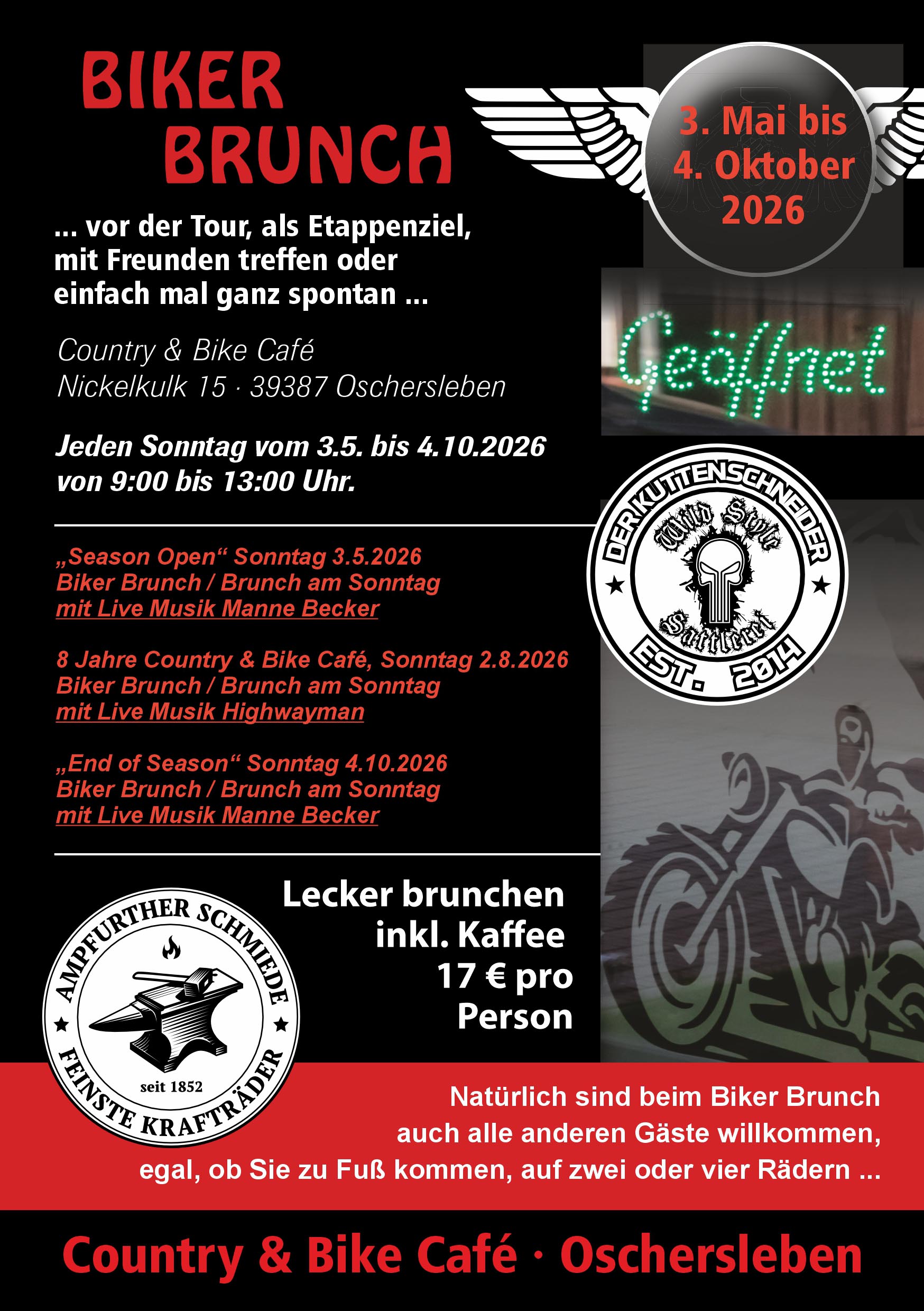 Der diesjährige Biker Brunch startet traditionell mit dem Season Open am 03. Mai mit Live-Musik. Erfahrungsgemäß ist die Gastronomie sowie das große Außengelände dann besonders gut frequentiert. Am 02. August steht dann das 8th Anniversary vom Country- & Bike Café an und am 04. Oktober endet der Biker Brunch mit dem Motto Season End.