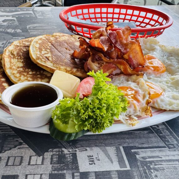 3 herzhafte Pancakes, 3 Spiegeleier oder Rührei, knuspriger Bacon, Butter und Ahornsirup plus eine heiße Tasse Kaffee, Preis: Nur 9,90 €
