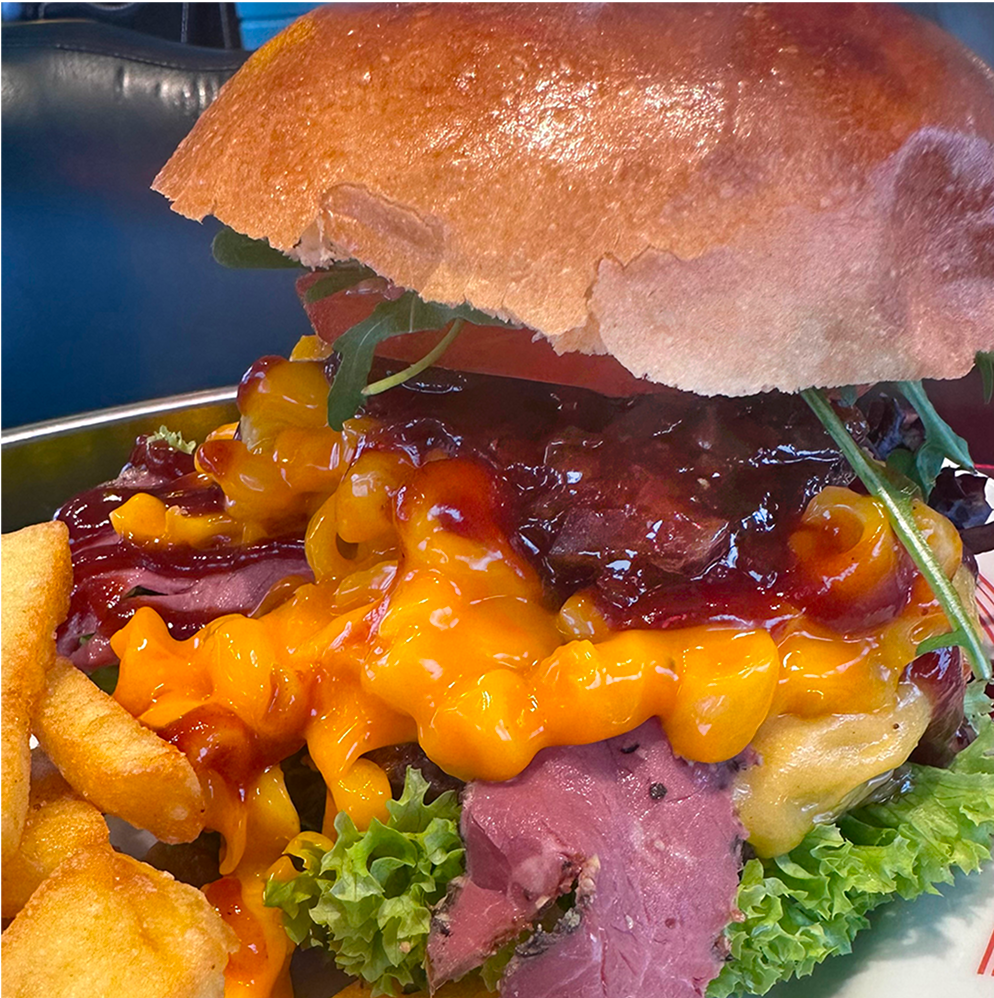 180 g Premium Beef Patty im Brioche Bun, getoppt mit Mac & Cheese, Pastrami, BBQ-Sauce, karamelisierten Zwiebeln, Salat & Tomate, serviert an Steakhouse Fries, Preis: Nur 16,90 €