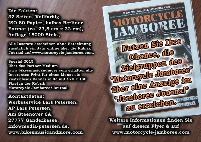Natürlich gibt es für das 26th Motorcycle Jamboree erneut ein Jamboree Journal in die Hand. In 2013 ging es erstmalig am Point of Sale für Biker in Berlin und Brandenburg sowie auf dem Event-Gelände in die Verteilung. Der Erfolg war gigantisch. Keine Streuverluste. Alle Exemplare weg. Was noch übrig war, diente als Belegversand oder Messeangebot. 2014 und 2015 sah das nicht anders aus.