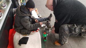 Susanne und ich sind durchaus stramm zwei Stunden unterwegs gewesen und haben cirka 15 Leute an ihren Plätzen versorgt. Die Tour kann aber durchaus mal bis zu drei Stunden dauern, je nach Frequenz. Ich habe für mich festgestellt, dass die mobile Akuthilfe mehr Raum für ein persönliches Gespräch bietet und äußerst effektiv ist. In der stationären Akuthilfe hatten wir immer mal wieder Leerlauf, hier steuert man direkt die Plätze an, fragt freundlich, ob Bedarf besteht. Mir gefällt das gut.