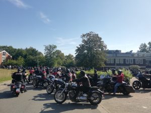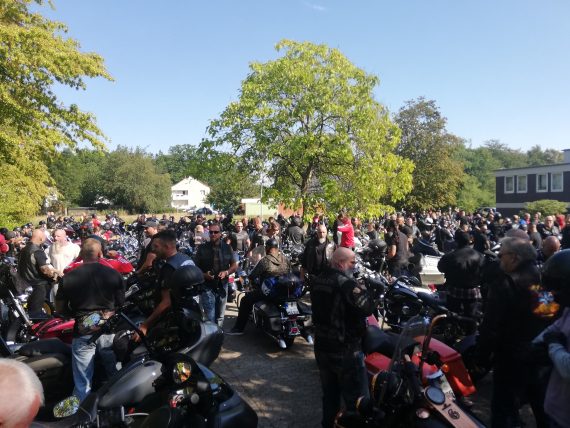 Am Treffpunkt waren schon frühzeitig so viele Trauergäste erschienen, dass mir schnell klar wurde, der Time Table könnte niemals eingehalten werden. Hunderte Bikes belagerten bei bestem Wetter das Areal um die Gaststätte „Lohner Forst“ herum. Im Lokal selber hielt das Charter ein großes Buffet für die Trauergemeinde bereit und präsentierte auf einer Leinwand Fotos von Joerg81. Hinter dieser war der Sarg aufgebahrt. Pünktlich verbrachten seine Brüder diesen nach draußen und stellten ihn auf einem Pick Up ab, geschmückt mit großen Kränzen, um direkt danach den Konvoi zu starten.