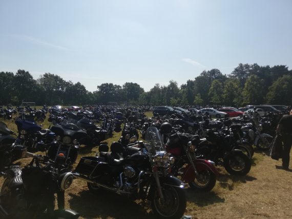 Hunderte von Bikes setzen sich in Bewegung. Ich reihte mich ganz hinten ein. Die Länge des Konvois war beachtlich. Das große Pack landete erwartungsgemäß später als geplant auf dem Waldfriedhof an. Es dauerte sehr lange, bis die letzten Bikes abgeparkt werden konnten. Dann setze sich der Trauermarsch in Bewegung. Aufgrund der heißen Temperaturen reichten Prospects am Rande des Trauerweges den Gästen Wasserflaschen. Am Grab hielt Micha81 eine kurze Grabrede, Ski King intonierte seinen ersten von zwei Songs. Nachfolgend wurde der Sarg in die Erde eingelassen!