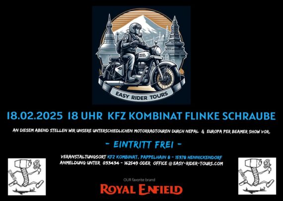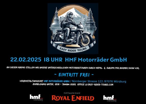 Nach meiner Kenntnis werden noch mindestens zwei weitere Events stattfinden. Wer also Fan der Kultmarke Royal Enfield ist und auf abenteuerliche Motorradreisen steht, dürfte hier gut aufgehoben sein. Easy Rider Tours freut sich jedenfalls auf jeden Besucher. Wer mit dem Gedanken spielt, in Nepal und/oder Europa etwas Besonderes auf dem Bike zu erleben, sollte sich an sich die Chance nicht entgehen lassen.