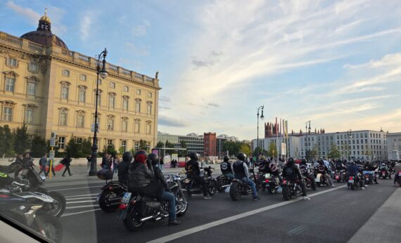 Der Himmel öffnete sich passend zum Start: Pünktlich zum Beginn des Korsos hörte der Regen auf – die Sonne begleitete die Biker durch die Berliner Innenstadt bis zum Kundgebungsort. Im historischen Lustgarten, vor der Kulisse von Berliner Dom und Stadtschloss, machten Redner deutlich, was das Motorradfahren für viele bedeutet: ein