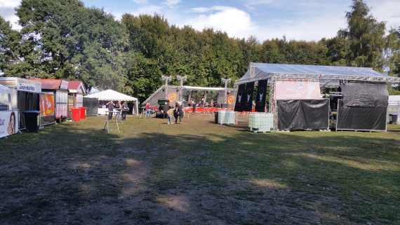 Pustekuchen. Kurz vor dem Konzertbeginn fing es erneut an zu regnen. Logen versammelten sich die doch recht zahlreichen erschienenen Besucher unter den Zelten. Dort herrschte Enge, vor der Bühne hatte man die freie Auswahl des Platzes. Schwitzend und gleichzeitig frierend kam ich nach dem vierten Song so langsam in den richtigen Modus. Letztlich schafften wir es, einen Teil der Leute tatsächlich bei dem Lied „Rockers und Partys“ zum Mitklatschen zu animieren. Danach übergaben wir an Daalschlag.