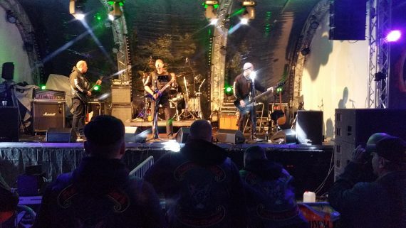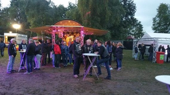 Insofern sah es zur Halbzeit gar nicht mal so schlecht aus. Doch wie würden sich die älteren Semester aus der Bikerszene am Samstag verhalten? Gemütlich auf der Couch bleiben und in die Glotze gucken oder sich aufraffen und mit fester Kleidung den Ritt wagen. Ich war bereits wegen unserem Soundcheck zur Mittagszeit mit dem Bike losgefahren und bekam satt auf den Kopf. Doch die Wettervorhersage wies ab 18 Uhr eine Regenwahrscheinlichkeit von 5% aus. Sauber, Stagetime 19 Uhr, das passt ja. Und da Frozen Silk, der Opener aus Fischtown, bei nahezu durchgehend trockenem Wetter einen mega coolen Gig hinlegten, hatte ich die Hoffnung, dass der Kelch an uns vorbei gehen würde.