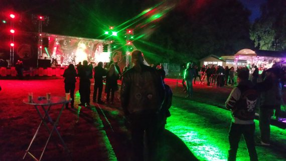 Da es bereits dunkel war, konnte man bei ihrem Einsteiger in das Set die Bühne erstmalig in vollem Einsatz genießen. Jo, das war ein echt amtliches Teil mit einer sehr wirkungsvollen Lightshow. Nur leider nahm der Regen zu. Muss das denn wieder sein? Doch die Männer von Daalschlag sind Profis und spulten wie gewohnt einen astreinen Gig ab. Sie leben von ihrer Spielfreude und die war voll da, obwohl sie am nachmittag schon beim SoA aktiv waren.