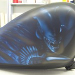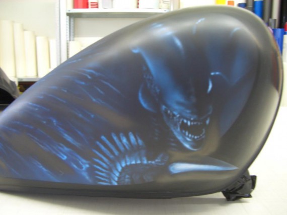 Na klar. Im Bereich Sonderlackierung sind wir sehr präsent. Wir führen die herkömmlichen Handairbrush-Arbeiten aus, speziell im Bereich Real Flames, Comic und Pinstripe haben wir schon sehr viele Arbeiten erstellt. Seit dem Jahr 2000 sind wir im Besitz eines Digitalen Airbrush-Computers, mit dem wir große Flächen von einem Quadratmeter bis über Hundert Quadratmeter brushen können! Da geht richtig was!