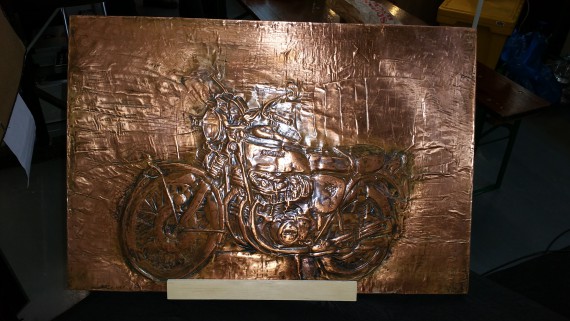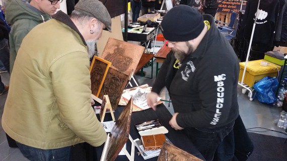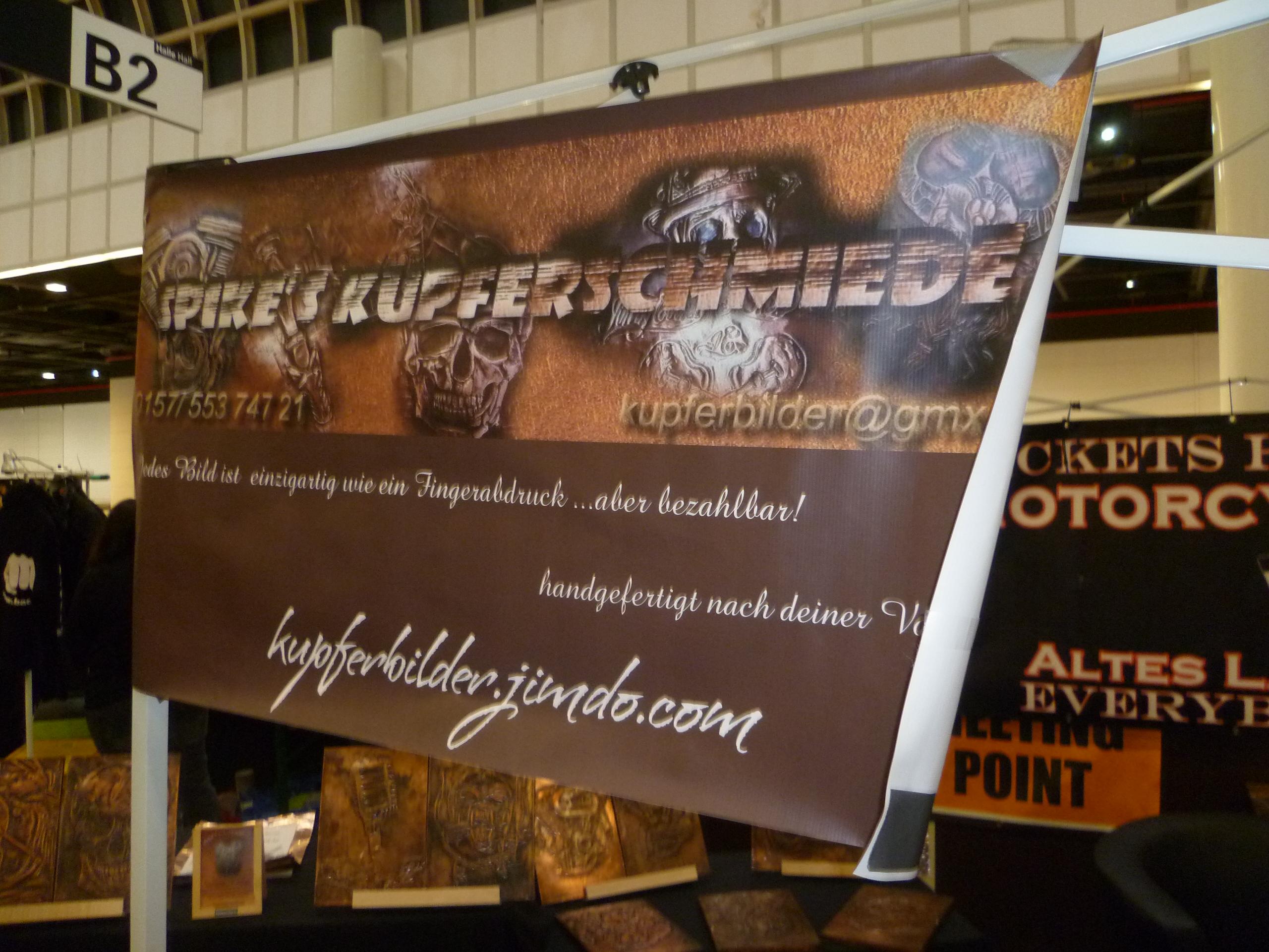 Für Spike und seine Kupferbilder war es die erste Messe überhaupt, an der er aktiv teilnahm. Auch er hatte am Samstag deutlich mehr Substanz-Gespräche, als am Freitag. Ein Verkauf war aufgrund der Messe-Vorgaben in der Meile zwar nicht möglich, aber ich bin davon überzeugt, dass er den Bekanntheitsgrad seines kleines Kunsthandwerkes deutlich erhöhte, und das es zu neuen Kunden-Kontakten im Nachhinein kommen wird. Wo wir das Feintuning ansetzen, weiß ich schon jetzt. Lernen muss er noch viel, aber Spike ist äußerst ambitioniert. Mit Unterstützung seiner Brüder packt er das!