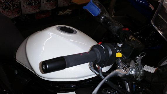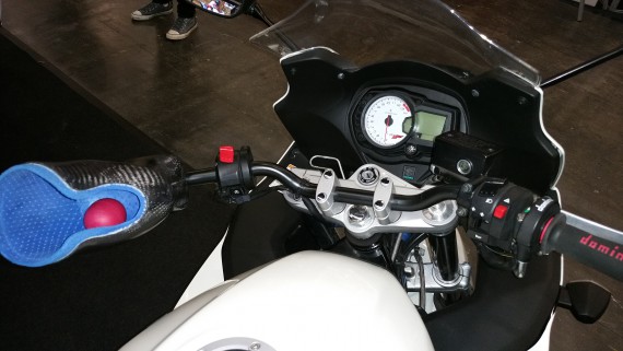 Ebenso der Stand von Mario Weiss, der neben seiner eigenen Motorrad-Werkstatt das Fischereihafen-Rennen in Bremerhaven promotet, an dem er regelmäßig aktiv als Fahrer an den Start geht. Mit Gerüst-Elementen hatte er einen Aufbau erstellt, wodurch das Banner des Traditions-Rennens hoch über der Meile thronte. Nicht zu übersehen! Bei ihm fiel mir das Bike eines Hand-Amputierten auf. Schaut euch mal die drei Bilder an. Was fällt euch auf?