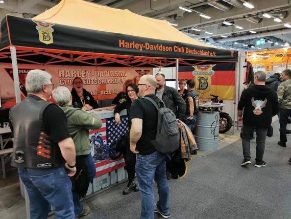 Der erste Stand auf meinem Weg durch die Club Meile wurde vom Harley Davidson Club Deutschland e.V. präsentiert. Mit dessen Presi Peter Niemeyer hatte ich schon durch seine bei Bikern bekannte Gastronomie Hoier Boier in Schleswig-Holstein zu tun. Nun konnte man endlich auch mal das Live-Gespräch führen. Die Truppe war gut drauf und kommunikativ, Kaffee und Kekse verlängerten die Verweildauer am Stand, es wurde Szene gequatscht. Der Stand wurde solide präsentiert.