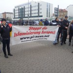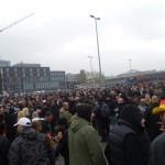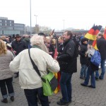 Das Versammlungs-Gelände war nun deutlich besser gefüllt. Die genaue Anzahl der Teilnehmer kann ich aufgrund der enormen Größe des ZOB’s absolut nicht einschätzen. Ich gehe von ca. 2500 Personen aus. Es hätten deutlich mehr sein müssen, doch die massiven Kontrollen der Polizei schreckten viele ab, oder sie wurden erst gar nicht auf den Platz gelassen. Ich konnte bei einem TV-Interview mit dem Polizeipräsidenten Mäuschen spielen. Er lobte die Einsatzleitung, rechnete selber nicht mit einer Eskalation, da die Hooligans offensichtlich klar erkannt hätten, dass sie heute keine guten Karten haben würden. Er stellte fest, dass die Auflage des Alkoholverbots sich voll bemerkbar machen würde, die Stimmung sei längst nicht so emotional wie in Köln. Dem pflichtete ich zu 100% bei. Ich habe auch noch nie so viele wassertrinkende Hools gesehen. Ob es ihnen gemundet hat?
