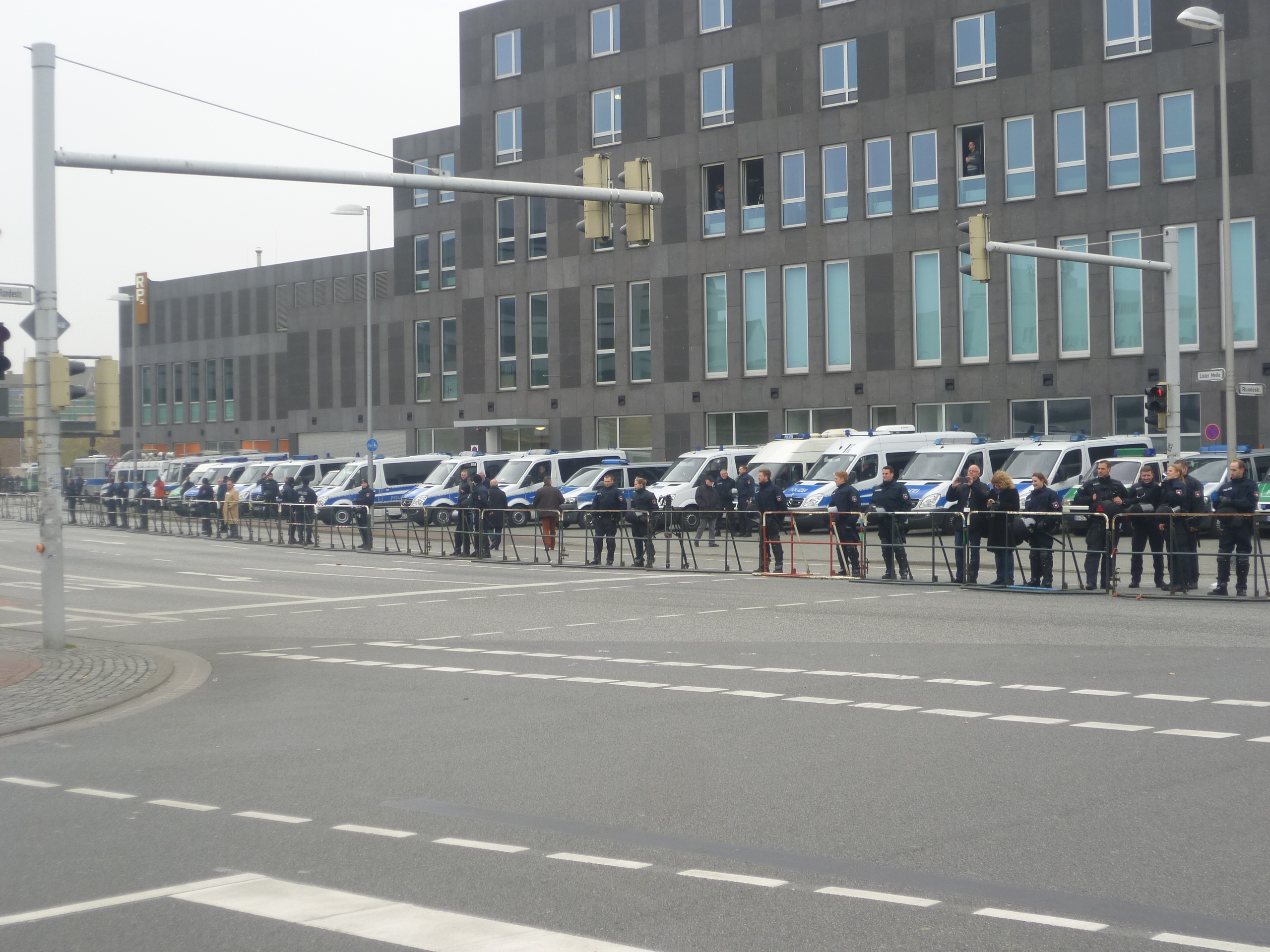 Im Bahnhof Hannover empfingen uns starke Kräfte der Polizei. Die 10minütige Wartezeit ermöglichte eine Kippe. Danach wurden wir auf den Veranstaltungsort geleitet. Keine dummen Sprüche, gespannte Erwartungshaltung allethalben.