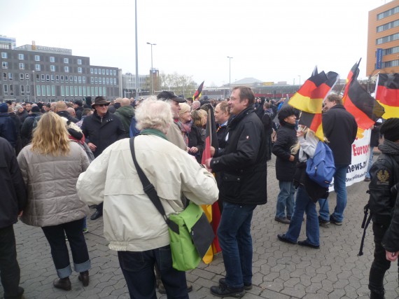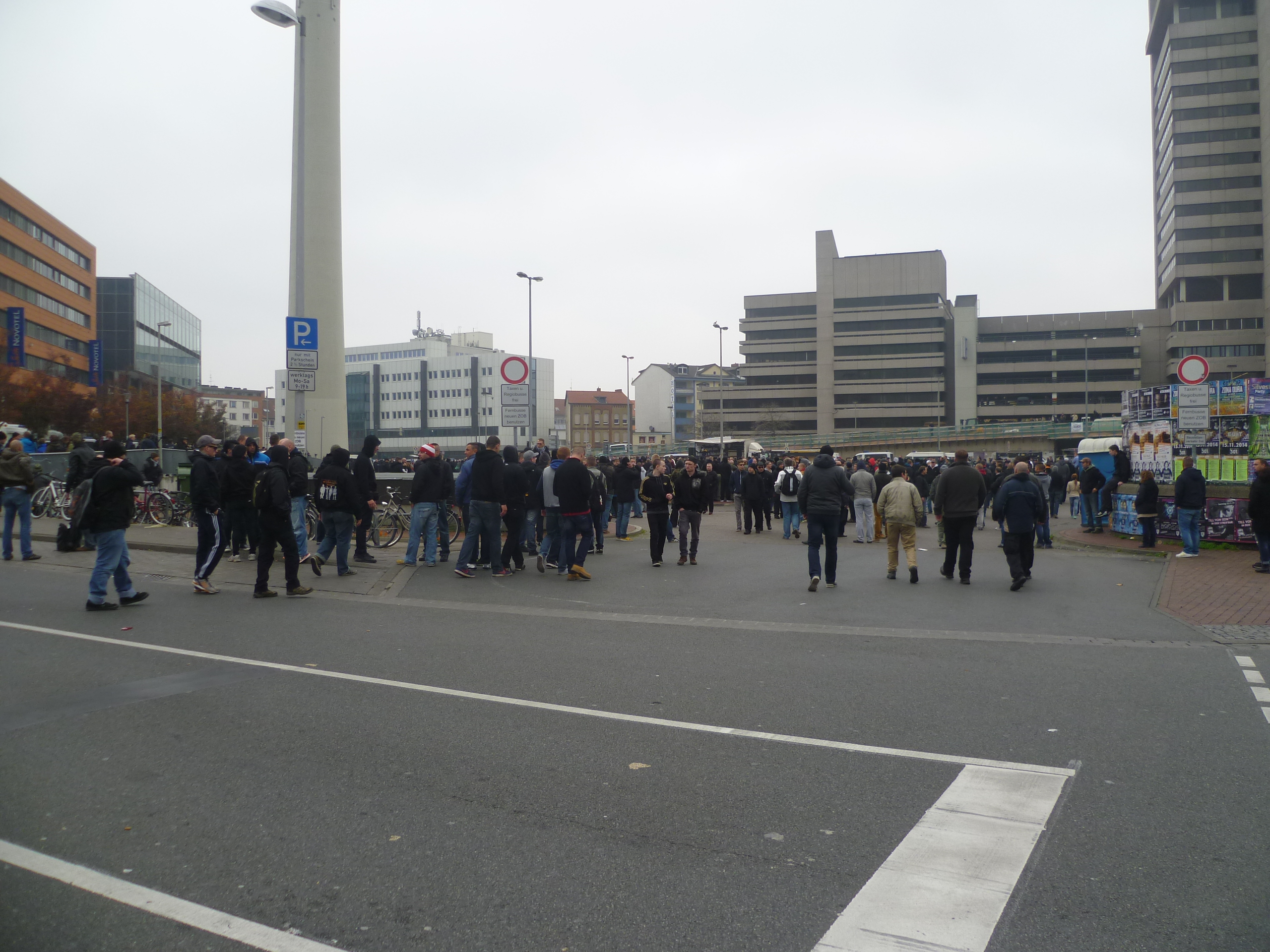 Das Versammlungs-Gelände war nun deutlich besser gefüllt. Die genaue Anzahl der Teilnehmer kann ich aufgrund der enormen Größe des ZOB’s absolut nicht einschätzen. Ich gehe von ca. 2500 Personen aus. Es hätten deutlich mehr sein müssen, doch die massiven Kontrollen der Polizei schreckten viele ab, oder sie wurden erst gar nicht auf den Platz gelassen. Ich konnte bei einem TV-Interview mit dem Polizeipräsidenten Mäuschen spielen. Er lobte die Einsatzleitung, rechnete selber nicht mit einer Eskalation, da die Hooligans offensichtlich klar erkannt hätten, dass sie heute keine guten Karten haben würden. Er stellte fest, dass die Auflage des Alkoholverbots sich voll bemerkbar machen würde, die Stimmung sei längst nicht so emotional wie in Köln. Dem pflichtete ich zu 100% bei. Ich habe auch noch nie so viele wassertrinkende Hools gesehen. Ob es ihnen gemundet hat?