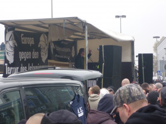 Die Holligans sind nicht gerade Presse-affin. Die Teilnehmer wurden aufgefordert, nicht mit der Presse zu reden, sondern diesen Job dem zuständigen Vertreter der HOGESA zu überlassen. Absolut richtig. Es waren nun einmal nicht ausschließlich nur helle Köpfe unter den Teilnehmern, bei einigen dachte ich echt, sie entstammen einem ZOMBI-Kabinett, zudem können die Demo-Teilnehmer nur für sich, nicht aber für die Aktion insgesamt sprechen. Die Interviews dauerten sehr lange, was ich aktuell als positiv empfinde. Die HOGESA wurde gehört. Nun kommt es aber auch darauf an, was daraus gemacht wird! Da von den Hooligans aber während der Demo keinerlei Provokationen ausgingen, rechne ich insgesamt mit einer eher unspektakulären Berichterstattung. Die Redner waren inhaltlich wesentlich besser aufgestellt, als in Köln. Die Wortbeiträge dauerten länger, man bemühte sich um Informationen darüber, warum man der Islamisierung in der Republik mit Sorge entgegen sieht. Das waren natürlich keine Polit-Profis, aber schwere sachliche Fehler oder rassistische Äußerungen konnte ich nicht feststellen. Und auf dem rechten Ohr bin ich beileibe nicht taub! NPD & Co? Mit mir nicht!