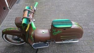 Meine Interessen lagen bereits in Kindertagen bei Autos, Motorrädern, Schiffen, also alles was sich bewegte und mit irgendeiner Mechanik versehen war. Die Ausbildung zur Mechanikerin brachte mir natürlich die Kenntnisse, die ich brauchte um an Motorrädern zu schrauben. Meine beiden „Mopetts“ mussten natürlich dran glauben! Trotzdem stand die Sattlerei immer im Vordergrund. Die Herausforderung einen Entwurf im Kopf zu haben und mit den eigenen Händen umzusetzen, war immer mein Antrieb.