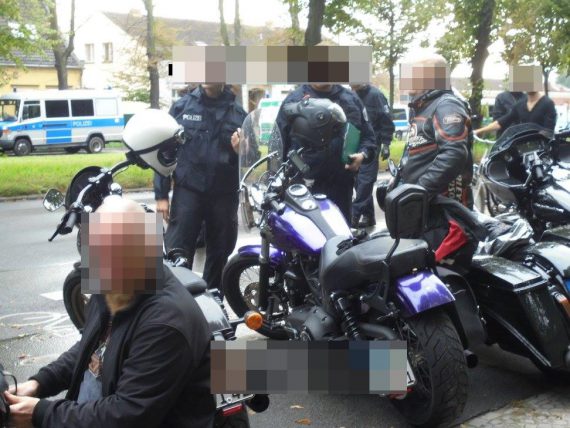 Das die Hells Angels von ihrem Demonstrationrecht gebrauch machen und ca. zwei Monate vor der Versammlung offiziell einen Demo-Konvoi angemeldet haben, scheint ja die Politik in Berlin derart angefixt zu haben, dass man in Kooperation mit der Rennleitung entschied, alles nur erdenkliche auf die Beine zu stellen, um ja nicht als zu passiv angesehen zu werden und um den Teilnehmern unmissverständlich aufzuzeigen, wer in der Republik das Sagen hat. Ohne Ende Mannschaftswagen, zig Beamte mit MP’s und massive Kontrollen von Personen und Bikes prägten das Geschehen vor Ort.