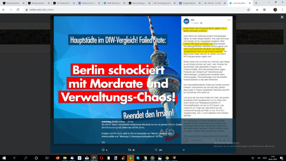 Von einer Studie erwarte ich, dass sie sehr sensibel, faktisch klar und differenziert vergleicht. Stattdessen hat das DIW-Institut vermeintlich alles in einen Topf gworfen. Und an dieser Stelle darf dann mal der Berliner Bürger für sich selbst beurteilen, ob es für ihn ok ist, wenn seine Stadt so beschissen dargestellt wird, wie es das Gutachten vermuten läst und ob es für ihn ok ist, wenn eine fahrlässige Tötung mit einem mit Vorsatz verübten Mord in Einklang gebracht wird. Das sollte dann auch die AfD so sehen und sich vor Veröffentlichung von Untergangspost mal selber das Zahlenwerk anschauen, bevor man derartig Stimmung macht.