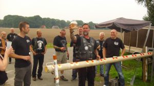 Im Vorfeld hatten die Gastgeber zu einigen Biker-Games aufgerufen. Schweineaugen-Weitspucken sowie der Motorblock-Weitwurf sorgten für reichlich Lacher und Kurzweil und brachten die Gäste in Stimmung. Nun, den Rest sollten wir mit unserem WRP besorgen, was bei Rockern und Bikern ja ein nie ganz einfaches Unterfangen ist. Am Ende von Set 1 hatten wir aber den Mob gut aufgewärmt, es folgten die Prämierungen, u.a. für den größten Club, die weiteste Anreise und das leichteste Mädchen.