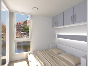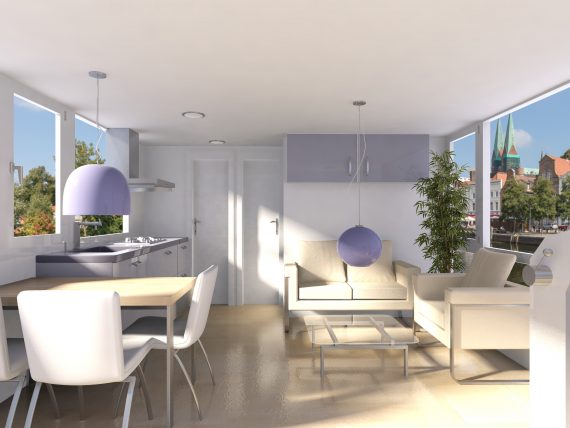 Auf unserem Hausboot bilden ein geräumiger Salon und eine Küchenzeile das Zentrum des schwimmenden Feriendomizils. Hier finden sich neben gemütlichen Sofas auch ein großer Tisch an dem gemalt werden, oder beim Kochen geholfen werden kann. Ebenso gibt es ein Bad – wenn auch im Miniaturformat – mit Dusche und WC.