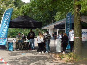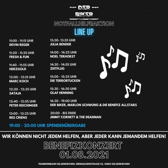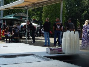 Bis zirka 10.30 Uhr groovte sich auf dem Gelände erst einmal alles ein. Buden und Stände wurden aufgebaut, die Leute nahmen ihre letzte Einweisung entgegen, doch Mainstage und Technik waren klar, ergo stand den Auftritten der Künstler nichts im Wege. Schwung übernahm natürlich neben der Orgaleitung auch die Moderation und machte zunächst klar, warum man hier und heute da ist und wer denn überhaupt das Benefizkonzert unterstützt hat. Die Liste der Unterstützer war lang, das Netzwerk hat letztlich gut funktioniert.