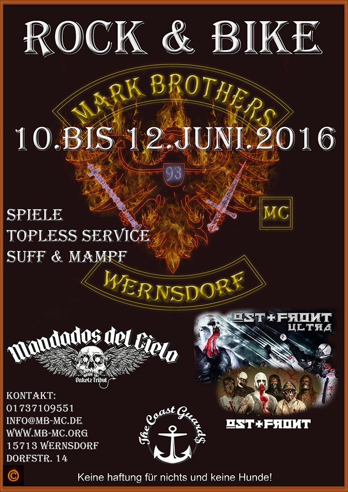 Alter Falter, als ich das Line Up des Rock & Bike-Weekend des Mark Brothers MC vom 10. bis 12. Juni gesehen habe, war ich echt baff. Die zünden dort musikalisch eine echt fette Nummer. Mit Ost+Front, Mandados del Cielo sowie den Coast Guards haben die Männer aus Wernsdorf ein heftiges Paket am Start.