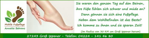 Genau hier setzt das Angebot von Annette Behrens aus Groß Ippener an. Denn im Radius von 30 KM um ihren Wohnort herum bietet sie die mobile kosmetische Fußpflege an. Sie kommt also zum Kunden und nicht umgekehrt. Das hat neben dem Entspannungsfaktor den großen Vorteil, dass Ihr immens Zeit spart und die Dienstleistung durchaus auch auf der Arbeit erfolgen kann.