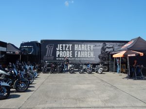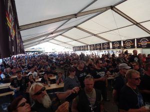 Auf den Punkt präsentierte sich der Wettergott bei bester Laune. Nachdem es am Mittwoch noch heftig geschifft hatte, herrschte ab Donnerstag bestes Wetter. Mehr geht nicht. Und sie kamen erneut zu Tausenden, die Biker. Bereits zum späten Nachmittag hatten etliche von uns das Gefühl, dass in diesem Jahr bereits viele am Donnerstag angereist sind, da augenscheinlich mehr Geländestreifen belegt waren als sonst. Tatsächlich lief der Vorverkauf sehr gut, aber ich führe diese optische Wahrnehmung der Platzbelegung eher darauf zurück, dass unter den Frühstartern auch deutlich mehr Gäste mit ihren Wohnwagen und Wohnmobilen anrollten.