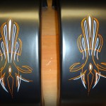 Ich habe natürlich gleich Lunte gerochen und konnte Julia für das Bikes, Music & More Vol. 5 als Presenter gewinnen, wo jeder Interessierte die Möglichkeit hat sie persönlich live und bei der Arbeit kennen zu lernen. Da mir selbst ihre Arbeiten gefielen, habe ich denn mal gleich statt der übliche Staubfänger aus Metall, dekorative Holzschilder mit Pinstriping als Preise für die Bike-Show und die Biker-Spiele geordert.