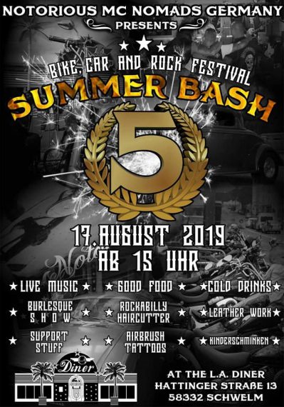 Der Summer Bash wir dieses Jahr zum 5. Mal ausgetragen und daher gibt es ein bisschen mehr als sonst. Wir haben einen Rockabilly Haicutter, eine Burlesque Show, was mal was anderes ist als ein gewöhnlicher Striptease, für die Kids haben wir Angebote wie Kinderschminken und Airbrush Tattoos. Geiles Fressen und Saufen gibbet natürlich auch und selbstverständlich Live Musik! Alles so, wie es sich gehört!