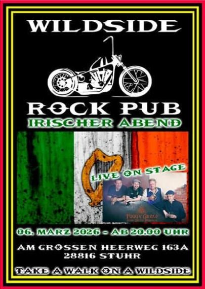 Es wird mottogerechte Bier- und Whiskeysorten geben, sicherlich u. a. Kilkenny und Guiness. Das kam bei den letzten beiden Irish Nights am besten an. Der Rest ergibt sich aus dem Gästemix heraus. Es gilt im Rock Pub Wildside „Everybody Welcome“ und natürlich kostet der Besuch keinen Eintritt. Also, im Kalender ein fettes Kreuz setzen und dann gilt am 06. März „Take a Walk on the Wildside!“